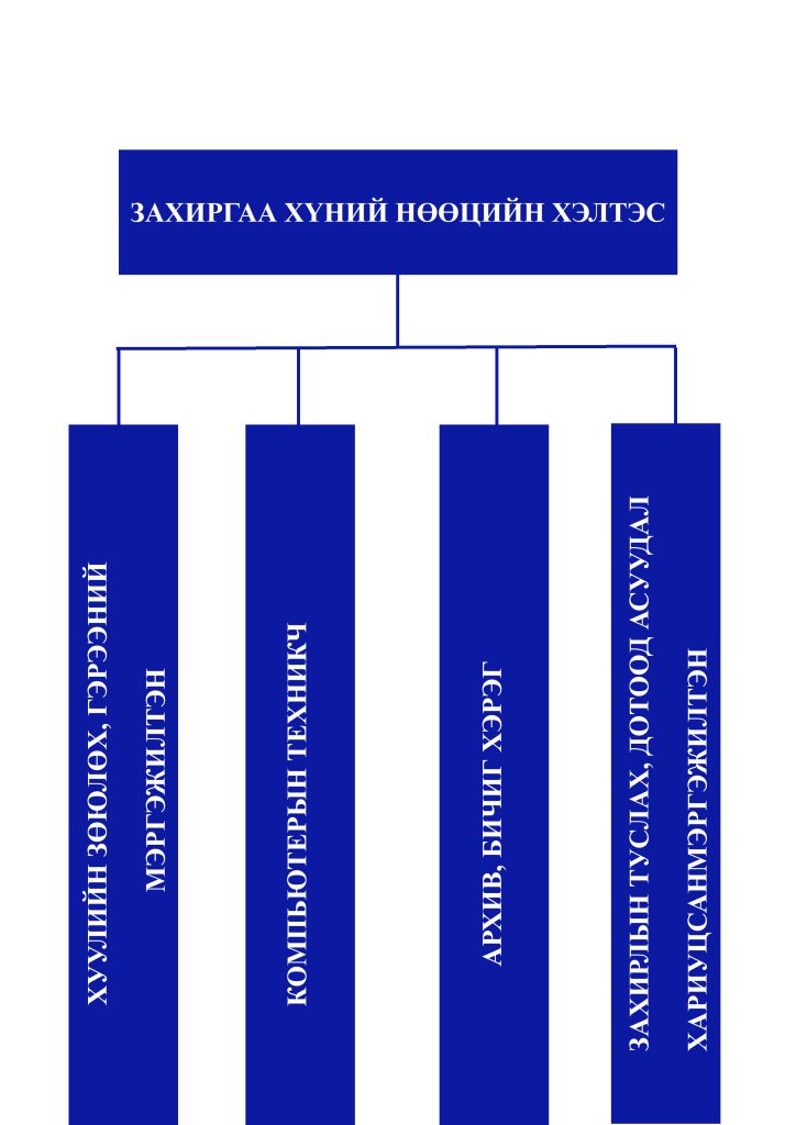 ЗАХИРГАА ХҮНИЙ НӨӨЦИЙН ХЭЛТЭС Захиргаа, хүний нөөцийн хэлтэсийн ажиллагсад нь Хүний нөөцийн хэлтсийн даргын удирдлаганд копьютерын техникч – 1, захирлын туслах дотоод асуудал хариуцсан мэргэжилтэн-1, архив, бичиг хэрэг- 1, хуулийн зөвлөх гэрээний мэргэжилтэн -1, гэсэн бүрэлдэхүүнтэйгээр үйл ажиллагаа явуулж байна.Үйл ажиллагааны үндсэн зорилго нь хүний нөөцийн бодлого, хөтөлбөрийг төлөвлөх, хамт олны дунд зохион байгуулах арга хэмжээг зохион байгуулах, өдөр тутмын үйл ажиллагаанд туслах, албан бичиг хэргийн ажиллагааг цаг хугацаанд нь түргэн шуурхай эрхлэн явуулах, конторын цэвэрлэгээ үйлчилгээг хийх, станцын харуул хамгаалалтын найдвартай ажиллагааг хангах юм.