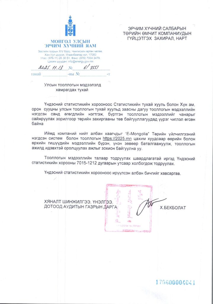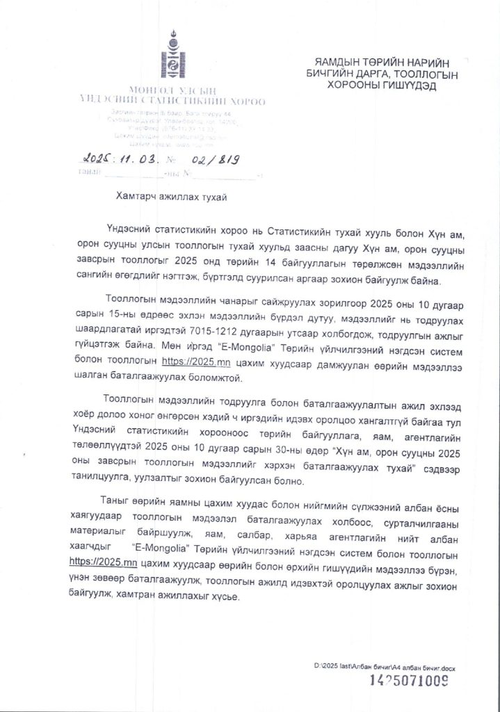 УЛСЫН ТООЛЛОГЫН МЭДЭЭЛЭЛД ХАМРАГДАХ ТУХАЙ